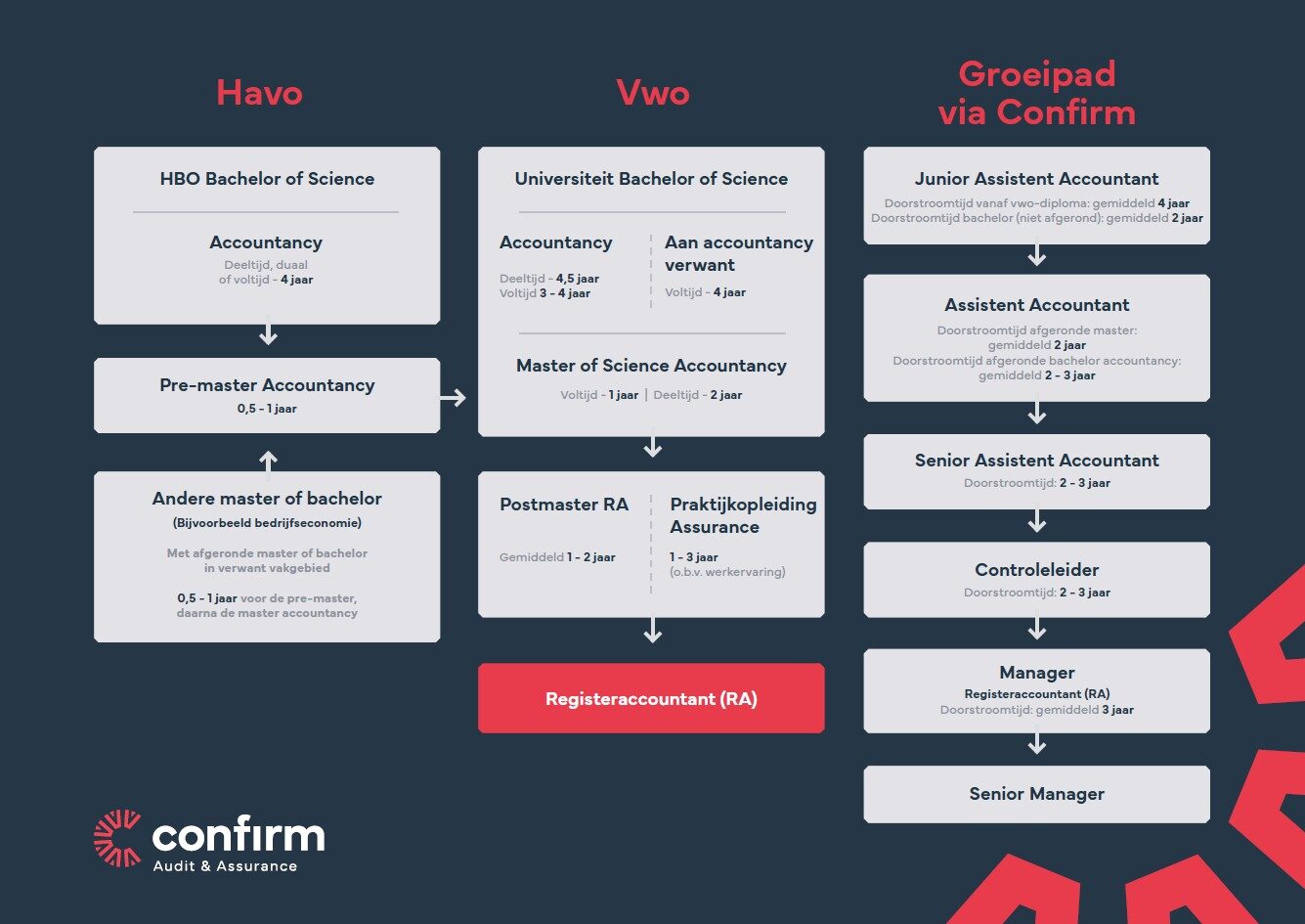 Bij Confirm kun je instappen op verschillende momenten: als werkstudent, junior assistent of na je hbo- of wo-studie. We hebben ons groeipad overzichtelijk in kaart gebracht: